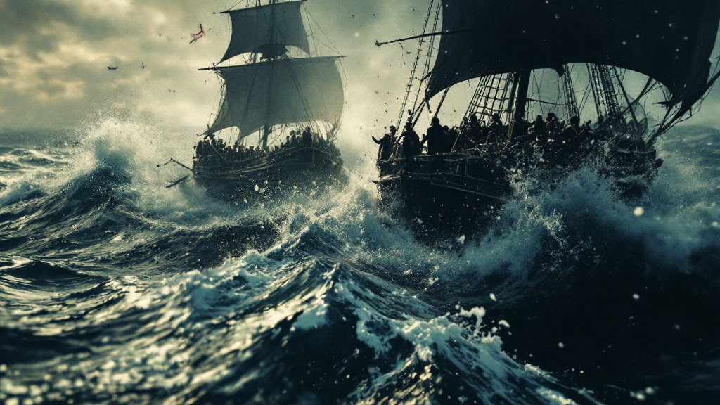 No entanto, a jornada de volta não foi sem seus perigos. Numa noite particularmente escura, quando a maioria da tripulação descansava, o silêncio foi brutalmente rompido pelo som ensurdecedor de madeira colidindo contra madeira. Um navio pirata Antch, com sua estrutura negra como a própria noite, havia se aproximado sorrateiramente e atacado. Em questão de segundos, dezenas de Antchs absurdamente armados invadiram o convés, suas espadas reluzindo à luz da grande fogueira acendida no navio Anch.